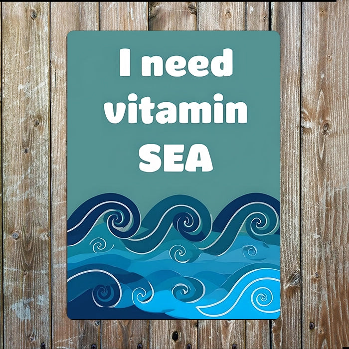 Celebrate your love for the sea with this sign that features the wording 'I need vitamin sea' on it. It has a blue background of swirling seas under the wording.